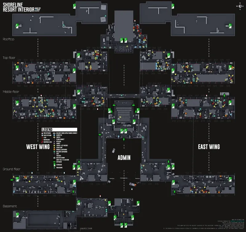 Das Küstengebiet nimmt einen großen Teil der Außenbezirke von Tarkov ein und liegt direkt neben dem Hafen. Das Gebiet beherbergt ein teilweise verlassenes Dorf, moderne Privathäuser, landwirtschaftliche Felder, lange Strandabschnitte, eine Bootsanlegestelle, eine Tankstelle, eine Wetterstation, einen Mobilfunkmast sowie weitere Gewerbebetriebe. Die Hauptattraktion von Shoreline ist das Azure Coast Health Resort, das aus mehreren Blöcken besteht und ausschließlich von einem nahegelegenen Wasserkraftwerk mit Strom versorgt wird. Das Resort diente zuvor als vorübergehende Unterkunft für Mitglieder der TerraGroup und der zugehörigen Abteilungen des Konzerns zur Vorbereitung auf die Evakuierung des Hafens von Tarkov.